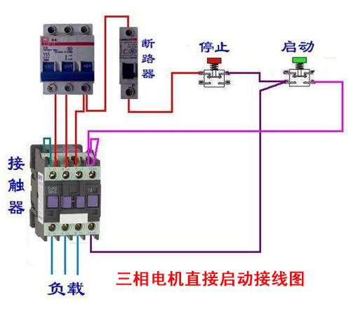 在一般情況下,由公用變壓器供電的三相電機,當單機容量小于14千瓦時,允許直接起動。用斷路器、啟動停止按鈕和交流接觸器組合在一起便組成一個Z簡單的直接起動控制線路。例如以下這個三相電機直接啟動接線圖就比較簡單,只要合上開關接通電源后,按下啟動按鈕,電機就能直接起動、運轉,按下停止按鈕電機便停止。