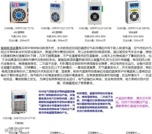 CS800、CS810、CS820、CS880配電柜除濕器 CS800、CS810、CS820、CS880系列的除濕器用于開關柜、配電柜、控制柜的除濕之用。這是一種排水弄除濕器,功率有大有小和相應的排水量。具體參數如下:看看視頻: Home > 配電柜 > 日期:2023-9-22 來源:m.cqlxgz.cn 發布:前前 閱讀: 上一篇:配電箱字母含義 圖紙中常見配電箱字母表示意思 下一篇:MTS-8030GY-32L、MTS-8060GY-32L電柜除濕器 配電箱安裝屬于什么工程 配電系統接地的設置 配電箱配置電器簡要說明 BCT系列電力配電用互感器 BCT系列電力配電用互感器 HBB-CS800電箱除濕器使用說明書.pdf 推薦 多功能電力儀表CPK-D3B的說明書HDZJ-130X 井蓋防盜系統行業國際形勢初學電工怎樣看懂電路圖 ZWN-G1(TH)智能溫度濕度控制器的產品概述接地電阻不準確的處理辦法和預防措施DH20G-100A電機保護器技術參數與使用S811R24N3S、S811R30N3S報價EVERQ6-320-6、QR75A1-I礦井風機起動裝置MZY1-5030、JJR2-200電動機晶閘管軟起R22空調內有空氣對空調有影響嗎 建議關注 消防泵啟動器MSKRQ1-S-7.5KP雙電源切換開關TLQ3-40排污泵啟動器JJ1-40KWATS雙電源開關BQ3-50A/4P智能雙電源自動轉換開關BJMQ8G-320/4PCB級雙電源轉換開關GFATS1-125/3PCBEPM-07電力網絡分析儀表雙電源切換開關W-N2/100A/4P(LCD)PZ211-1U1X1 數顯電壓表TH300VA-44離心風機軟啟動ADR5-45KW交直流電測儀表RC-EMP194Z-9HY水泵軟起動SNR5-400電力電容制造BSMJ0.42-20-1雙電源和雙回路切換裝置TKQG-800