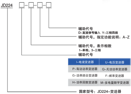 JD224系列變送器用于電力參數(shù)的信號轉(zhuǎn)換之用,將電流、電壓、功率、頻率等電參數(shù)轉(zhuǎn)換成標準的4*20MA或0-20MA信號。此系列變送器分為單相變送器和三相變送器,具體型號功能請細看以下型號定義。