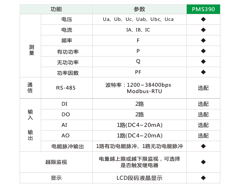 PMS390系列三相智能電力儀表是針對中低壓智能用電管理與能耗監測而研制的集遙測、遙信、遙控于一體的智能化測控電表,具有極高的性價比,可直接代替盤表,獨立應用于高低壓開關柜、交流盤、儀表控制盤、UPS等任何需要電量測量和顯示的場合,廣泛應用于工業、建筑、民用供電系統和變電站中。